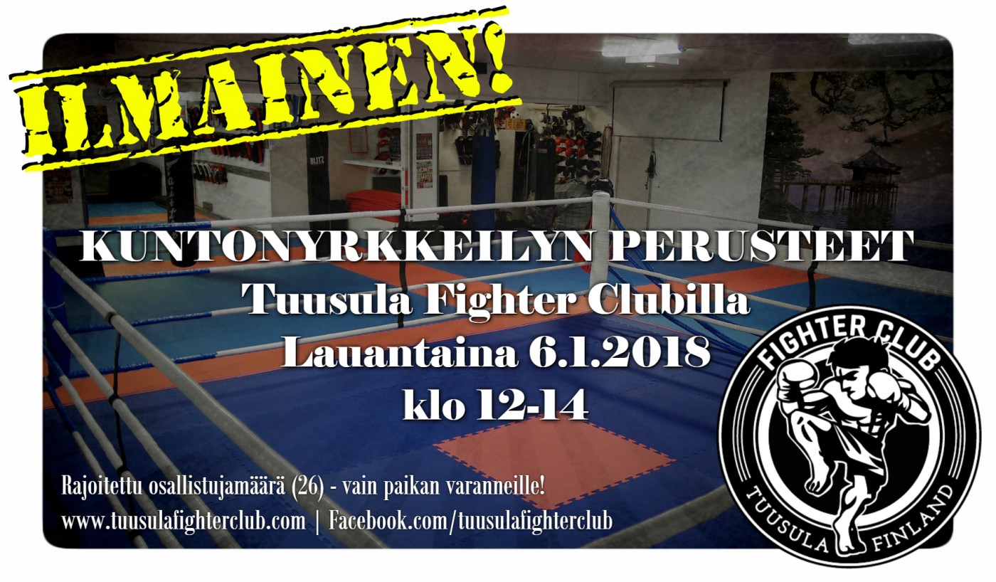 HUOM! Osallistuminen on täysin maksuton, mutta paikkoja on rajoitetusti (26), joten varaa oma paikkasi mahdollisimman pian! Ilmoittaudu Facebookissa yksityisviestillä tai sähköpostilla tuusulafighterclub@gmail.com.