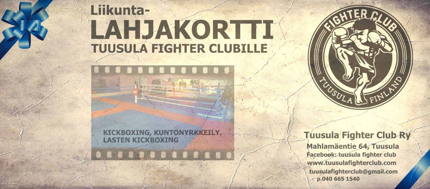 Lahjakortit ja lisätiedot yksityisviestillä tai sähköpostilla tuusulafighterclub@gmail.com