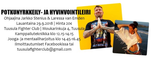 Mentaalivalmentaja ja entinen ammattilaisthainyrkkeilijä Jarkko Stenius sekä energiavalmentaja ja thainyrkkeilymestari Laressa van Emden saapuvat vetämään päiväleirin Tuusulaan! 😍 Tapahtumasivu: https://www.facebook.com/events/984560435041380/ • Lauantai 29.9.2018 • Tuusula Fighter Club, Moukarinkuja 4, Tuusula • Hinta 20€, maksu käteisellä paikan päällä • Sisältää kaksi harjoitusta: -> Kamppailutekniikka klo 12.15-14.15 -> Jooga- ja mentaaliharjoitus klo 14.45-16.45 Leiri sopii kaikentasoisille lyöntipotkumäiskintäpystykamppailulajien... Continue Reading →